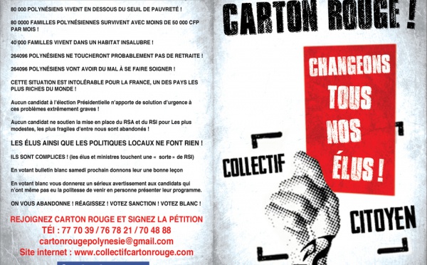Le collectif carton rouge appelle l' électorat polynésien à voter blanc au premier tour de l'élection présidentielle. Un tract sera distribué samedi...