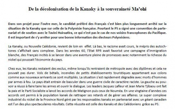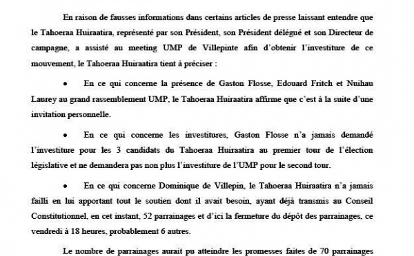 En raison de fausses informations dans certains articles de presse laissant entendre que le Tahoeraa Huiraatira, représenté par son Président, son...