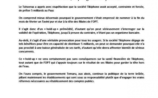 Le Tahoeraa a appris avec stupéfaction que la société Tikiphone avait accepté, contrainte et forcée, de prêter 5 milliards au Pays On comprend mieux...