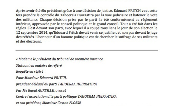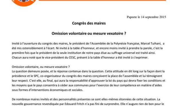 PAPEETE, le 18 juillet 2015. Voici le communiqué officiel adressé par le Tahoera'a Huiraatira expliquant les raisons de la dissolution de la...