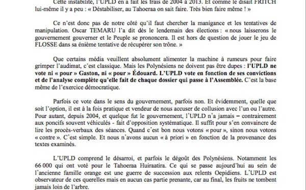 L'UPLD réagit par un communiqué signé de Antony Géros aux querelles qui divisent les deux hommes forts du Tahoera'a: