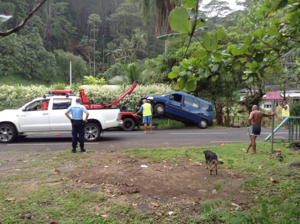 Samedi, une femme gendarme en service conduisait au niveau du PK 22 à Tiarei, sur la côte Est de Tahiti quand un chien a déboulé sur la route. La conductrice a voulu l'éviter mais elle a alors perdu le contrôle de son véhicule. La voiture bleue a alors fini sa course dans une rivière. Il n'y a eu heureusement aucun blessé. Le gendarme a été contrôlé négatif à l'alcoolémie.