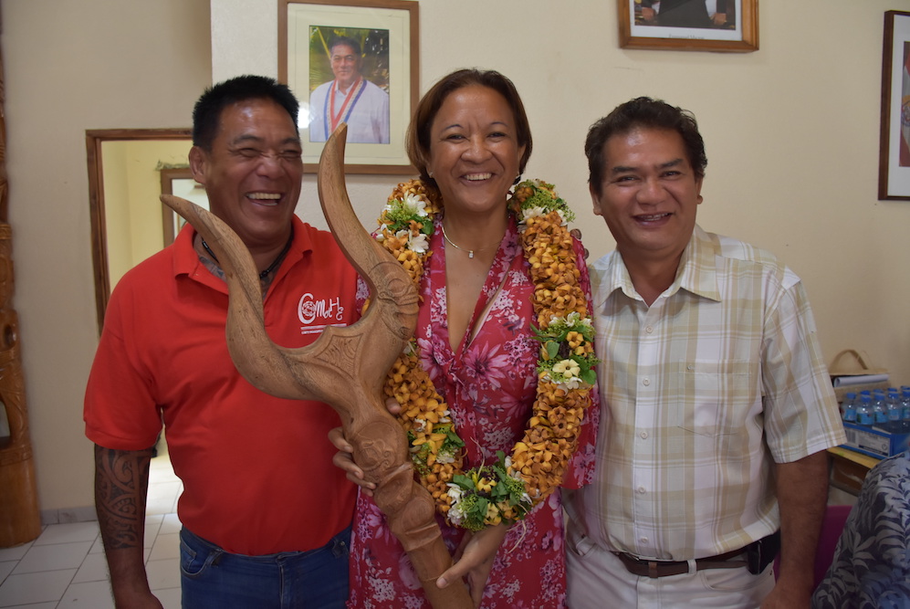 La sénatrice Lana Tetuanui en compagnie d'Étienne Tehaamoana, maire de Hiva Oa, et de son premier adjoint.