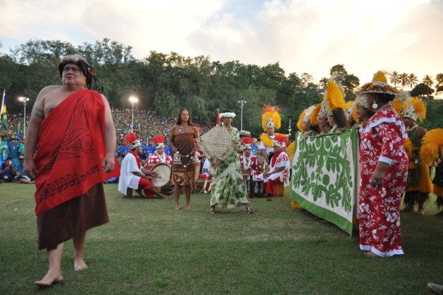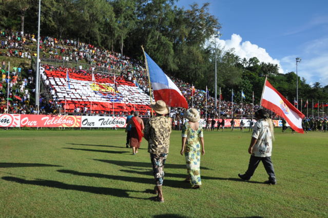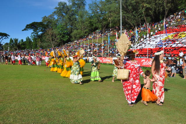 Le défilé des pays n’a rien perdu de son charme et ses couleurs. Drapeaux, costumes et instruments de musique étaient portés fièrement par chaque membre de délégation. La Polynésie Française a éveillé la foule. La prestation de danse offerte au Gouverneur des îles Salomons au moment de l’offrande polynésienne a ravi le public, dont les cris et applaudissements n’ont cessé depuis le premier coup de toere.