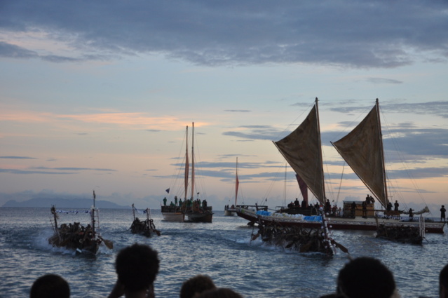 C’était à la lueur des feux de bois que les salomonais ont procédé à leur cérémonie d’accueil. A 5h, sur la plus grande plage d’Honiara, les délégations participant au Festival ont reçu le présent du pays hôte selon la tradition locale. Les pirogues de guerre salomonaises ont par la suite ouvert le chemin aux pirogues du Tavaru. La cérémonie protocolaire s’est déroulée dans l’après midi, au stade Lawson Tama.