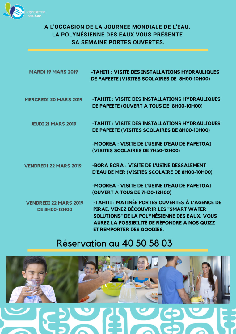 PAPEETE, le 14 mars 2019 - Dans le cadre de la journée mondiale de l'eau qui se tiendra le vendredi 22 mars, la Polynésienne des eaux invite le public à se rendre à leur agence clientèle de Pirae. De 8 heures à midi, vous pourrez découvrir divers stands tournés sur leurs actions.