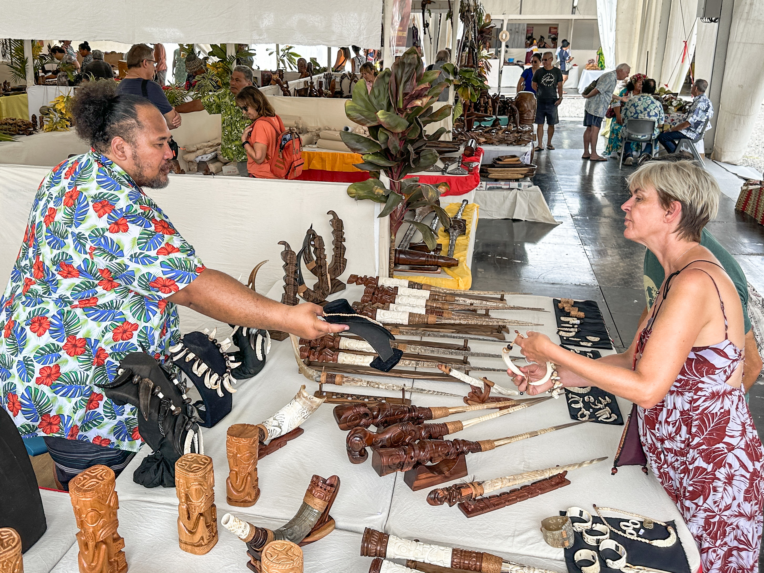 “Je n'avais jamais fait de haka auparavant, c'était l'occasion. En tout cas, c'est moins facile qu'on ne le pense, il faut savoir garder le rythme”, témoignait un homme d'un certain âge, assez courageux pour répondre à l'invitation des danseurs. Et pour cause, il fallait du cran pour oser participer à la danse du cochon : “Allez les hommes ! Faites les cochons ! Les femelles vous regardent”, lançait avec humour le chef de troupe durant le haka puaka. Et une fois l'ambiance assurée, ce dernier invitait le public à se rendre dans les stands : “Allez-y, les vrais artistes, ce sont eux ! Laissez-vous porter par vos envies et soutenez nos artisans venus de loin !” Le grand public a jusqu'au 26 novembre prochain pour visiter ces artisans et leurs œuvres.