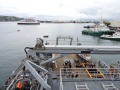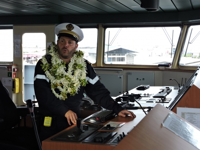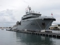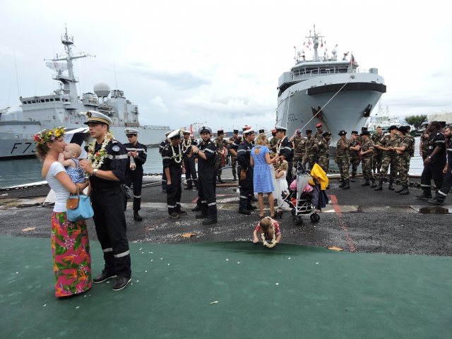 PAPEETE, le 16 décembre 2016. Le B2M (bateau multi-missions) Bougainville est arrivé à la base navale de Papeete ce vendredi matin après 51 jours de mer et cinq escales. Il a été accueilli par les militaires des forces armées en Polynésie français, des autorités de l’Etat, du Pays et des acteurs civils du monde de la mer. Des tirs au canon de salut (tir à blanc) ont été réalisés depuis la base navale à l’arrivée du bateau. Il s’agit d’une tradition de la marine.
