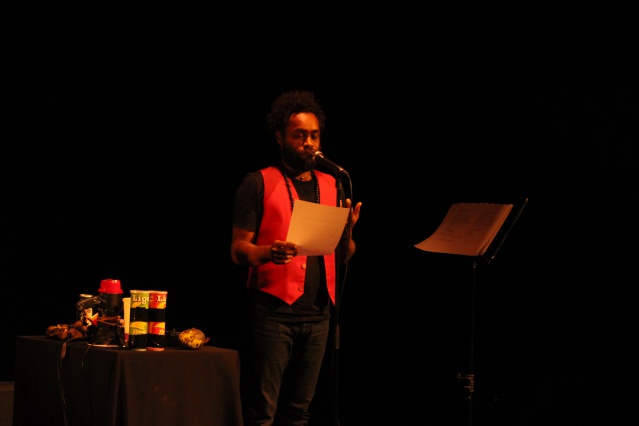 Guillaume Gay s’éclipse. Paul Wamo, assis en fond de scène dans l’obscurité se lève, il s’avance. Il s’approche du micro pour prendre la parole. Il a écrit un texte spécialement pour l’événement, s’interrogeant sur l’alimentation, ses codes, sa transmission : "Il y a : nourrir le ventre et nourrir la tête. Il y a : la nourriture spirituelle et la nourriture en barquette. Il y a : avaler un message et avaler du ma’a ", a-t-il placé avant de se présenter. "Je m’appelle Paul Wamo Taneisi, je viens de l’île de Lifou en Calédonie. Chez nous, on dit qu’avoir un mauvais ventre, c’est avoir un mauvais fond."