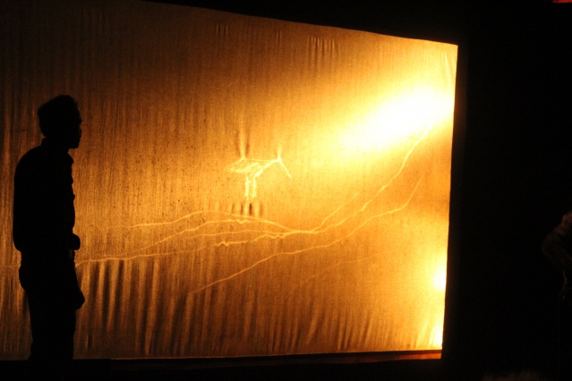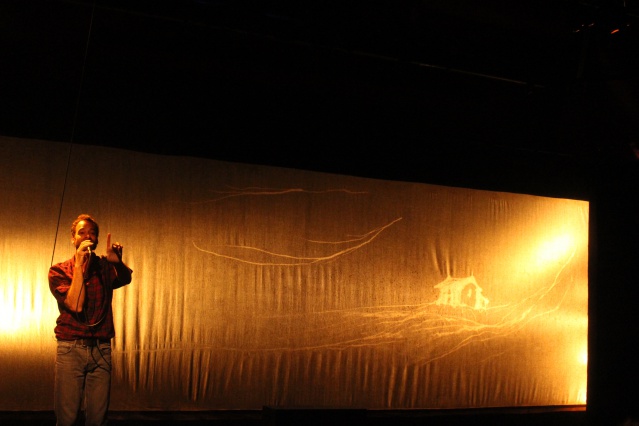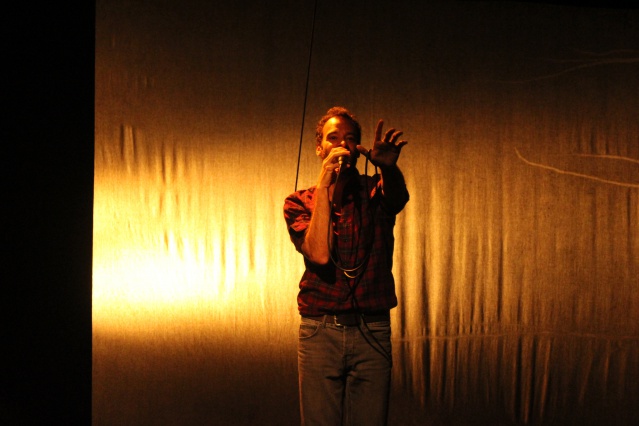 Mais avant de lancer le débat, Paul Wamo a été remplacé sur scène par le trio de la compagnie du Cri de l’armoire. Mathias Castagné est entré le premier, guitare à la main. Le son de l’instrument a empli la salle. Un point lumineux a éclairé le coin d’une toile, tendue au fond de la scène. Une onde est passée sur la toile. Comme un souffle. Marien Tillet, auteur, metteur en scène, acteur, a attrapé un micro suspendu pour nourrir l’espace de ses mots.