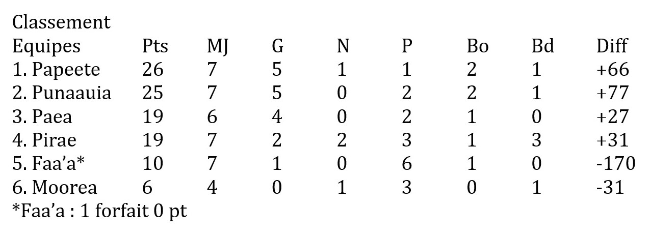 En attendant, place à la fin du Championnat de Tahiti à XV et à la phase finale à venir qui s’annonce passionnante, Paea le champion en titre, Papeete, Punaauia et Pirae étant d’un niveau sensiblement équivalent sur ce que l’on a constaté lors des dernières journées de championnat. A noter que le club de Pirae rentre d’un stage en Nouvelle-Zélande ce qui pourrait lui permettre d’être encore plus compétitif en phase finale. La 8e journée du championnat de Tahiti à XV sera clôturée samedi avec l’affiche Punaauia-Paea.