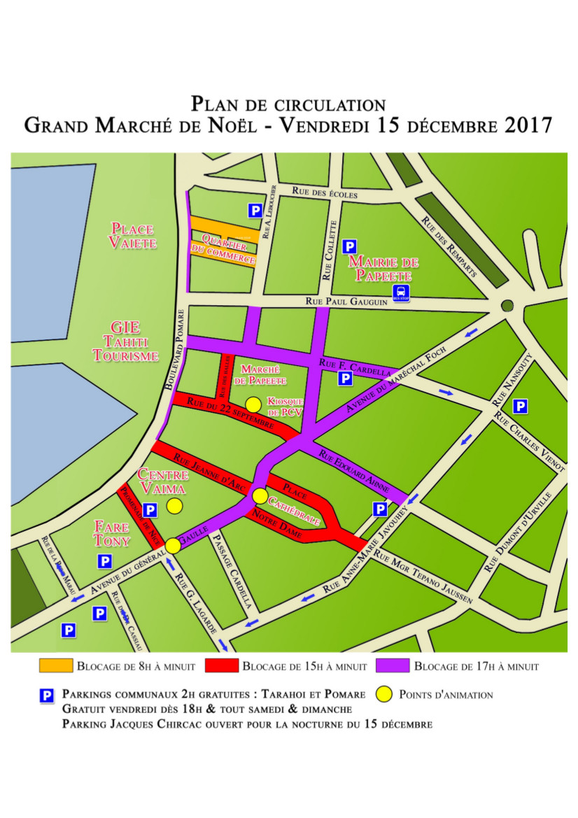 Pour se garer, la mairie de Papeete offre dans la journée deux heures de parking dans les parcs de stationnement de Tarahoi et Pomare. Ces parkings sont ensuite gratuits à partir de 17 heures. Les parkings de la place Jacques Chirac et au-dessus d'Odyssey, sont payants mais seront ouverts exceptionnellement vendredi soir.