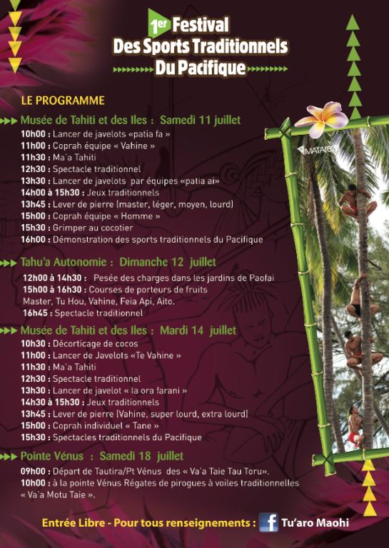 En marge des chants et danses, les jeux traditionnels proposés par 31 associations de Tahiti et ses îles et leurs 783 licenciés, connaissent déjà un engouement remarquable chaque année auprès du public. Avec cette évolution notable, le spectacle devrait attirer encore plus de monde sur les trois sites habituels, le Tahu’a Autonomie de Papeete, le musée des îles de Punaauia et la pointe Vénus à Mahina. Des spectacles de danse seront proposés par les îles Marquises et les îles Australes en marge des concours.