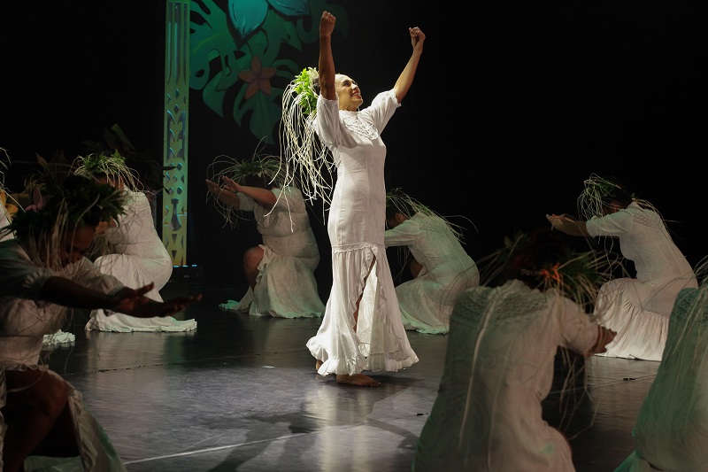 La troupe Te ui hou no Tautira est ensuite entrée en scène pour interpréter un mehura et a souhaité mettre en lumière les trésors de la Presqu’île et notamment de la partie cachée de Tahiti Iti, Te Pari. Le groupe a donc choisi le thème de Te Pari et de sa végétation luxuriante – Te Pari ‘e to na heeuri. Ce petit bout de la Presqu’île de la côteest était représenté par des jeunes danseuses originaires de Tautira et des jeunes de la paroisse de la commune.