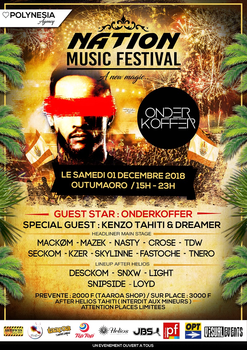PAPEETE, le 13 novembre 2018 - Le Nation Music Festival était initialement prévu pour le samedi 24 novembre 2018 au parc Paofai, mais il est finalement décalé au samedi 1er décembre 2018 de 15h à 23h sur le plateau de Outumaoro. Le festival de musique électro, dont les profits seront reversé aux associations de lutte contre la pauvreté, recevra un DJ international : Onderkoffer.