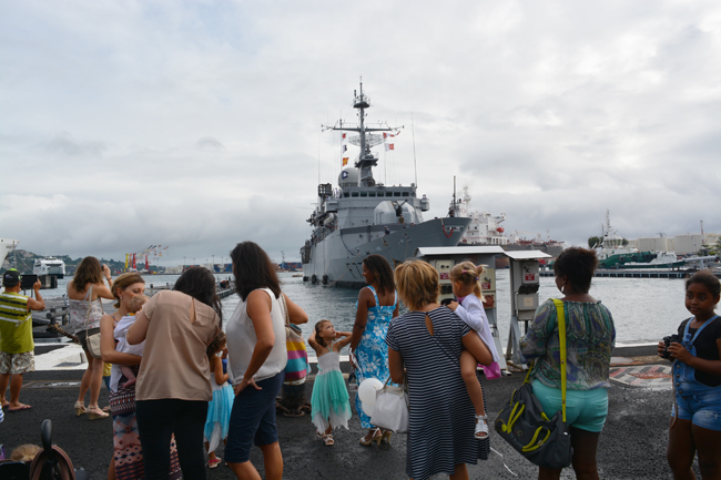 Le Prairial s'apprête à s'amarrer au quai de la base navale de Papeete. Après trois mois de séparation, les familles sont impatientes.
