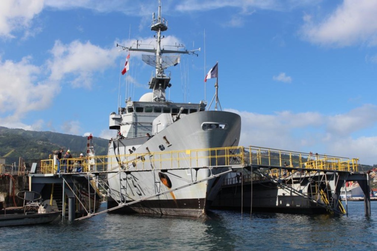 PAPEETE, le 17 août 2017 - La frégate de surveillance Le Prairial est sur le dock flottant depuis ce mercredi. Le navire est en arrêt technique majeur. Au programme : installation d'un nouveau bossoir, visite de la tourelle de 100 mm, mise en place d'un nouveau système de sécurité incendie… Le chantier, réalisé par Naval group (ex-DCNS), va employer entre 60 à 80 personnes au pic de son activité.