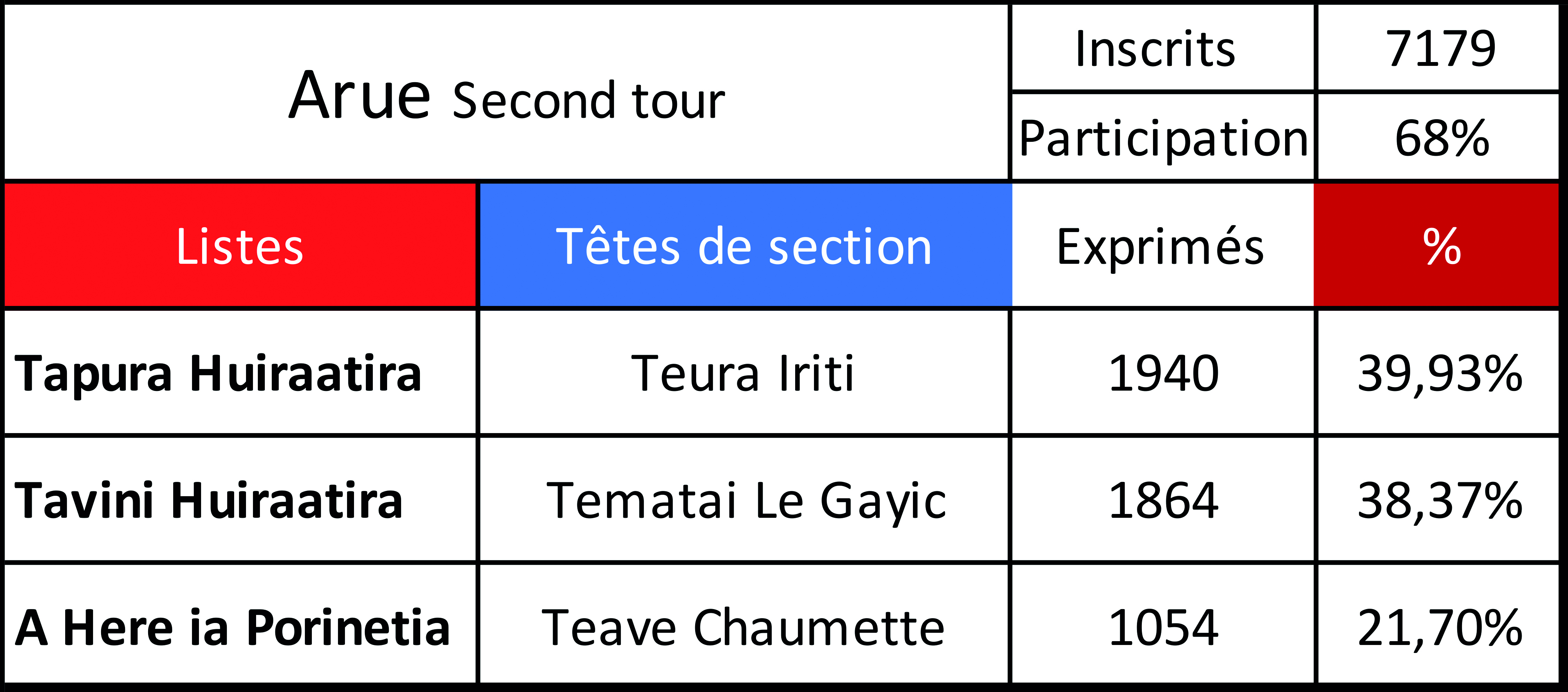 Tahiti, le 30 avril 2023 – Comme au premier tour, le Tapura tient la commune de sa tête de section, Teura Iriti, d'une courte tête avec 1 940 voix (39,93%) contre 1 864 (38,37%) pour le Tavini, quand A Here ia Porinetia gagne un peu plus de 200 voix. Le Tapura n'a pas fait le plein des voix autonomistes, dont une partie s'est nécessairement reportée sur le parti bleu ciel.