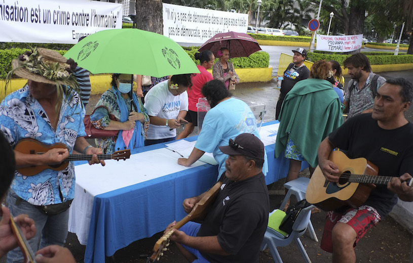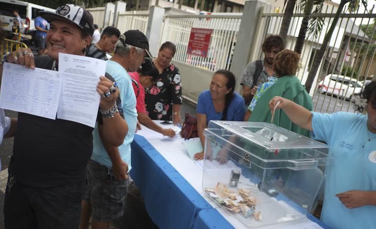Les membres du Tavini se sont rendus, comme prévu, vendredi matin devant le tribunal de Pape'ete pour faire signer la pétition annoncée par le leader indépendantiste Oscar Temaru. Pétition qui concerne notamment l'autodétermination, le droit de propriété (…) sur l'ensemble de ses ressources naturelles, marines et sous-marines, une justice indépendante et impartiale et le crime contre l'Humanité concernant les essais nucléaires. Les généreux donateurs se sont succédé tout au long de la journée pour y déposer leur contribution financière fixée à 1 000 Fcfp minimum.