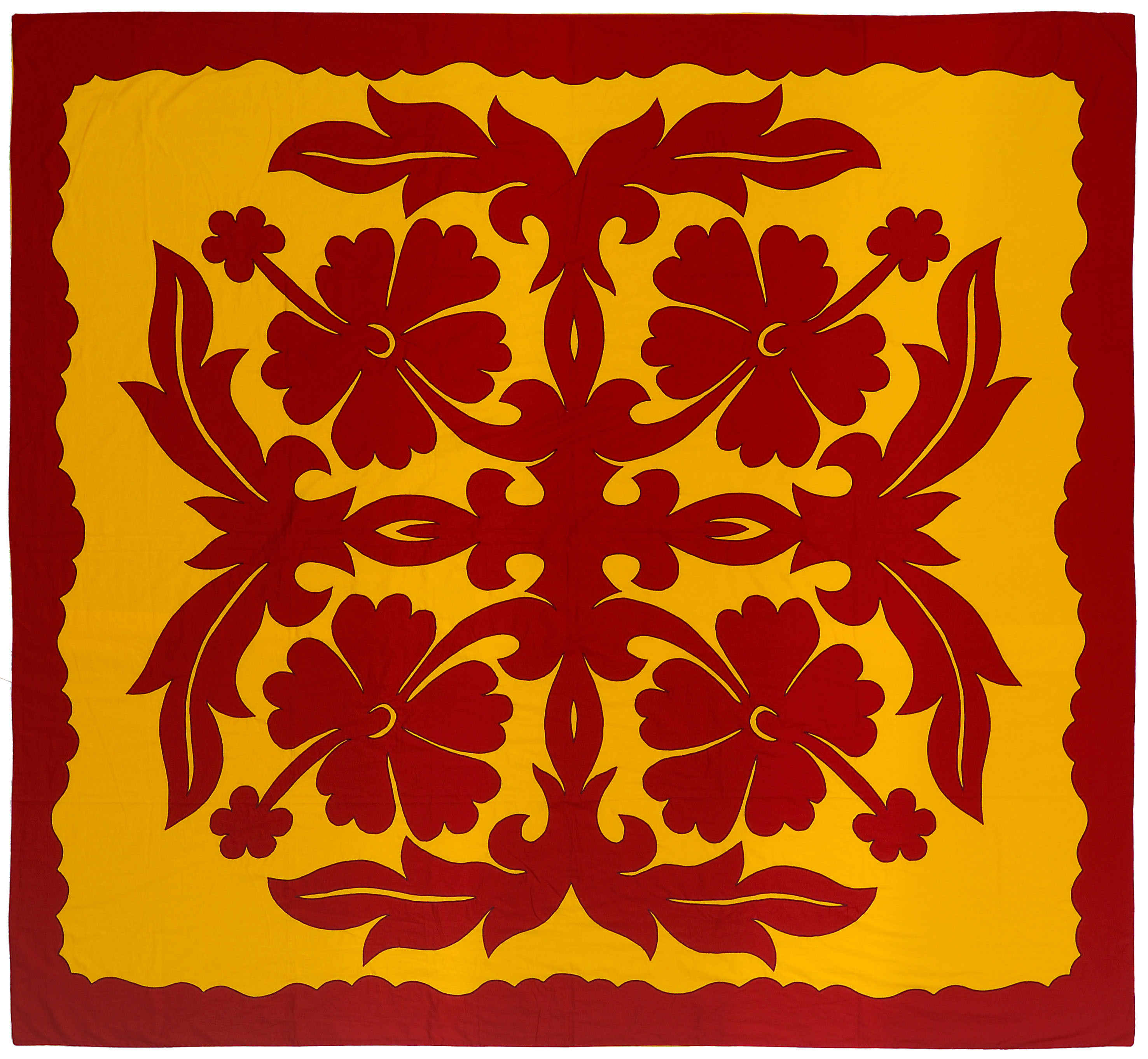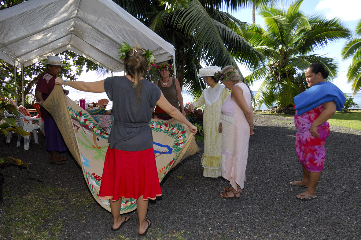 Largement inspiré de la technique du patchwork, c’est de la rencontre entre les femmes de missionnaires et les femmes polynésiennes, issues de la bourgeoisie locale au XIXe siècle, que la technique de confection du tifaifai s’est transmise d’île en île, de famille en famille au gré des alliances et des migrations. A une époque où le tapa est progressivement délaissé au profit des tissus, leur confection s’avère utile et économique, permettant de recycler les vêtements usagés jusqu’aux plus petites chutes de tissus. Enfin, la réalisation collective des pièces dans le traditionnel fare pupu est une pratique déjà bien ancrée dans les moeurs des femmes polynésiennes, mariant une technique extérieure à d’autres formes d’artisanat local, notamment la maîtrise du tressage et de ses motifs récurrents. Leur créativité sans limite permet ainsi d’exalter des inspirations puisées dans la richesse de la nature environnante.