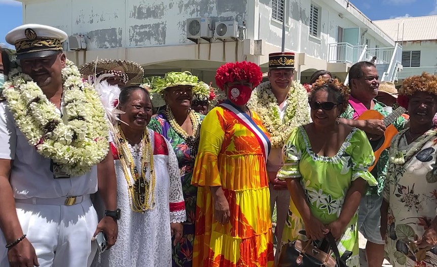La délégation a reçu un accueil paumotu chaleureux de la part de la commune avec des chants, un korero de bienvenue, des rafraîchissements et une remise de cadeau. Lors de cette petite cérémonie d’accueil le général Peloux s’est vu attribuer un nom paumotu “goio-tua-rehu”, qui évoque le nom du noddi brun, un oiseau assez rare et qui voyage très loin.