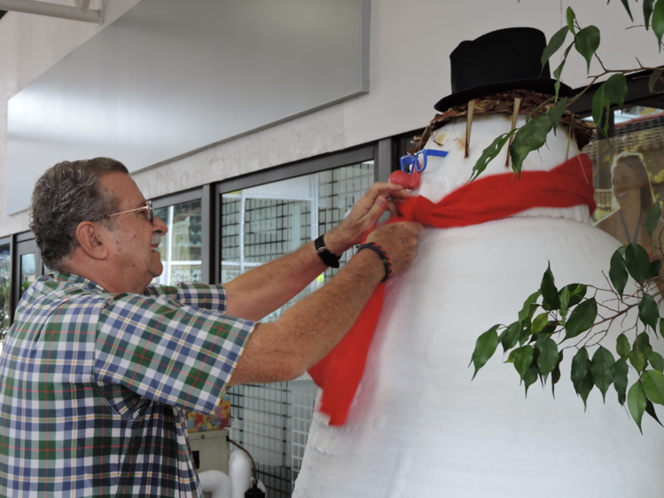Au premier étage du centre Vaima, on peut croiser depuis ce mardi matin un bonhomme de neige. Il a été baptisé Olaf, du nom du personnage du célèbre dessin animé La Reine des neiges. Ce personnage inhabituel est le fruit de l'imagination de Joël Conan, de la bijouterie Tara Eden. Celui-ci a ce projet en tête depuis près d'un an. "Cela n'avait aps pu se faire en 2015 car c'est un projet qui demande beaucoup de technique", explique Teiri Morlot, collaborateur de Joël Conan. "On a fait appel à la société Techno froid pour nous aider à faire un bonhomme de neige réussi."