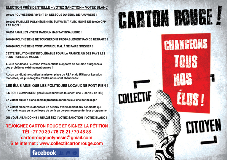 Le collectif carton rouge appelle l' électorat polynésien à voter blanc au premier tour de l'élection présidentielle. Un tract sera distribué samedi matin