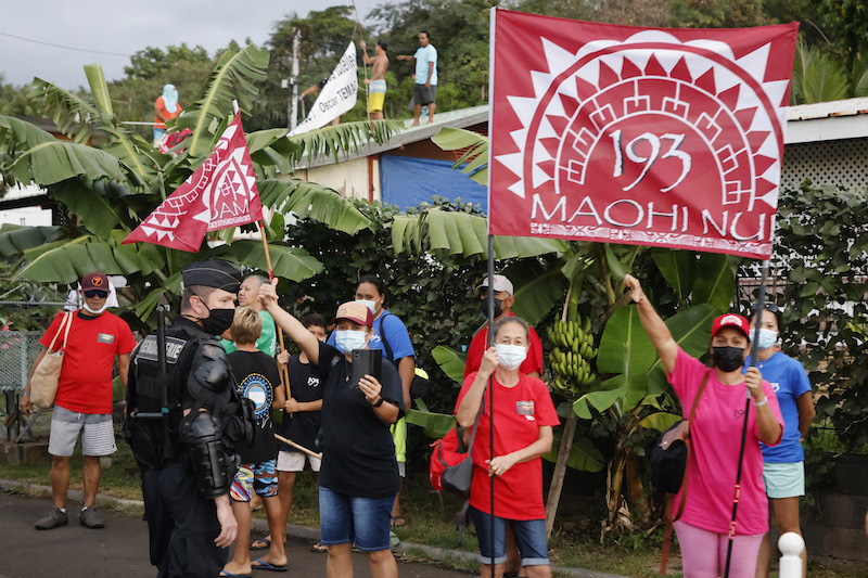 Tahiti, le 24 juillet 2021 – Malgré l'interdiction de manifestation opposée par le haut-commissaire au Tavini, les militants du parti indépendantiste et de l'association 193 se sont postés sur le passage du cortège présidentiel à Faa'a, encadrés par un important dispositif de sécurité.