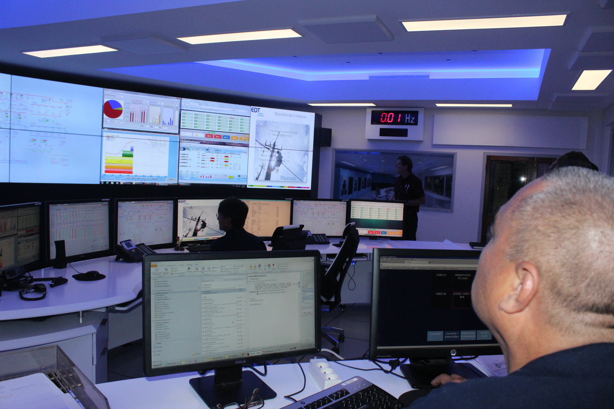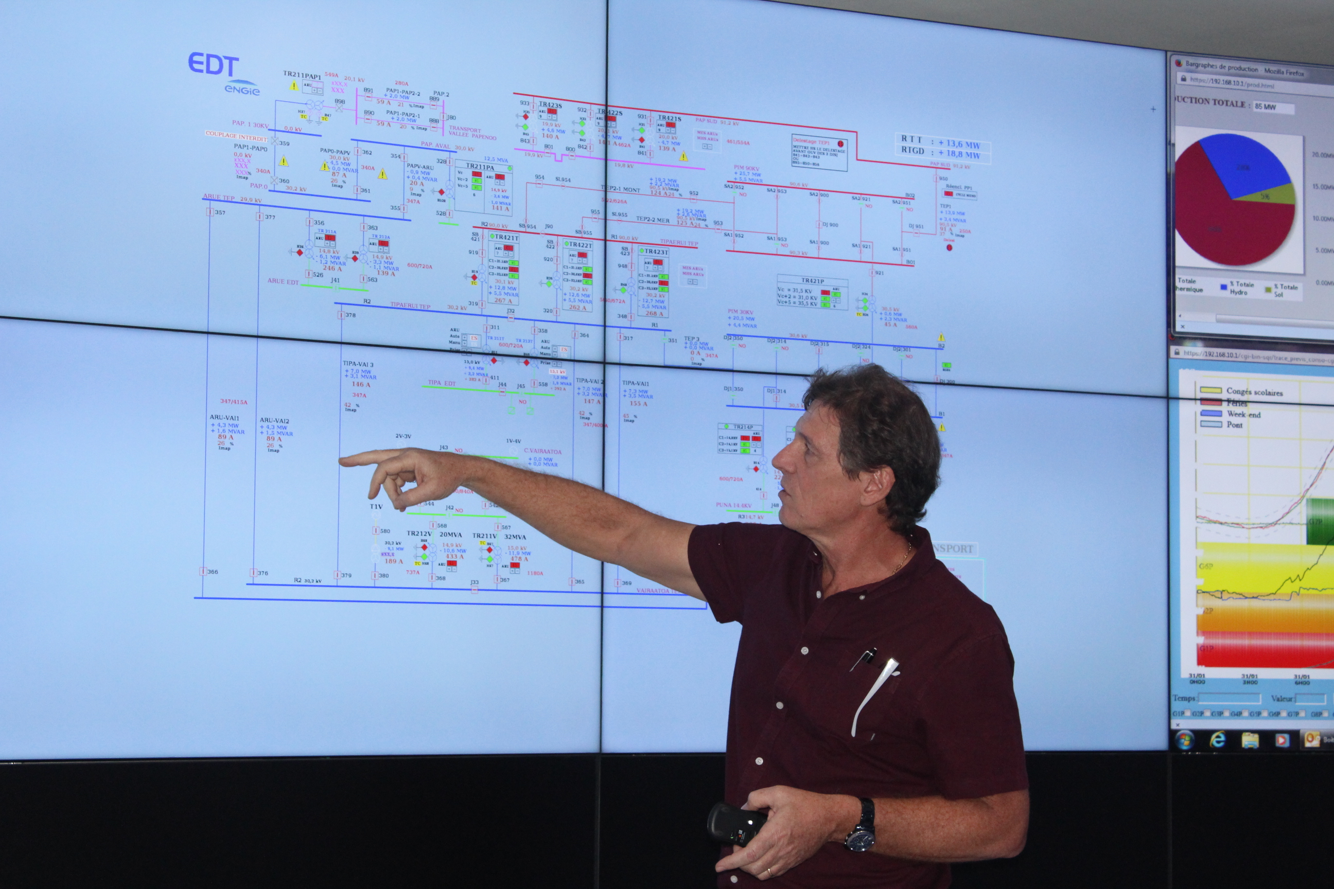 Côté, production, en 2016, l'électricité à Tahiti était composée de 60.3% d'énergie thermique, de 34.4 % d'hydroélectricité et de 5.3 % solaire, avec 1640 installations photovoltaïques sur le réseau électrique. Il faut souligner qu'EDT Engie a l'obligation par le gouvernement de placer en priorité les énergies renouvelables dans la limite d'écoulement du réseau. L'énergie solaire, produite par intermittence en fonction du soleil et des nuages qui aiment parfois jouer au chat et à la souris, corse la donne. Et à ce jeu-là, le dispatcher doit faire preuve de vivacité et de réactivité.
