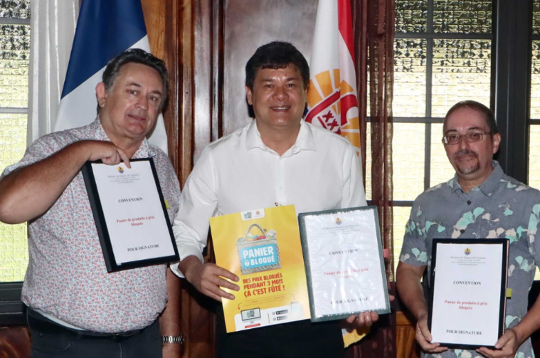 Tahiti le 27 décembre 2022 - En cette période d’inflation des prix de produits du quotidien, le gouvernement entend proposer des paniers de produits à prix bloqué. Le ministre de l'Économie et des Finances, accompagné des présidents de la Fédération générale du commerce, a signé la convention “panier bloqué”, mardi.