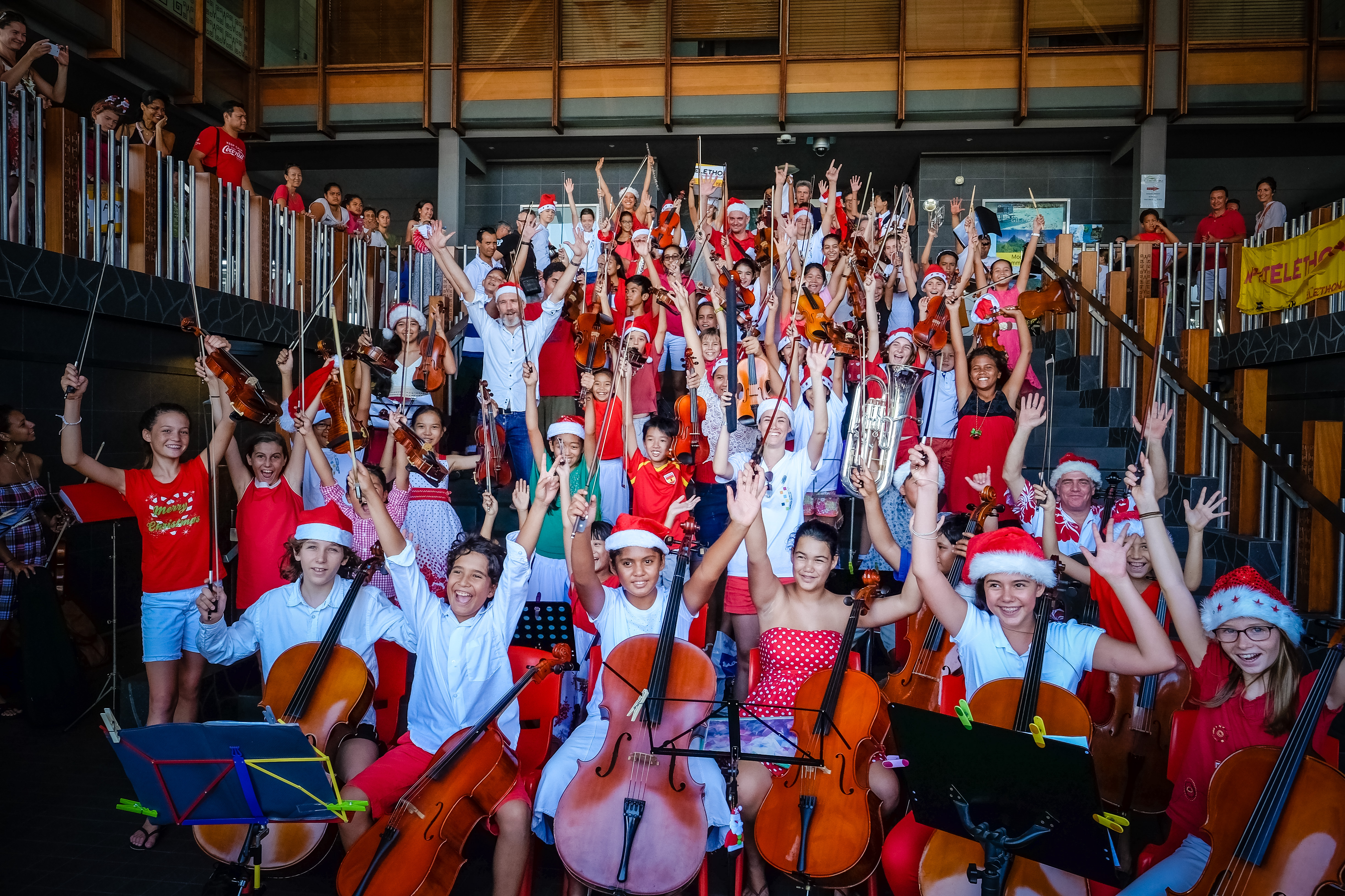 PAPEETE, le 3 décembre 2016. Les quelque 70 jeunes élèves du petit orchestre à cordes dirigés par Amandine Clémencet, renforcés par leurs camarades des vents et des percussions, et les musiciens des ensembles de flûte et de clarinette du conservatoire dirigés par Christine Goyard et Léa Le Bozec ont fait fort, ce samedi 3 décembre, prouvant une fois encore le rôle de la musique et des arts dans l'effort de solidarité envers les grandes causes comme la recherche et l'enfance.