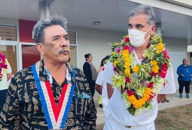 Dominique Sorain était à Rikitea mardi, accueilli notamment par le tāvana Vai Gooding. (crédit @commune des Gambier)