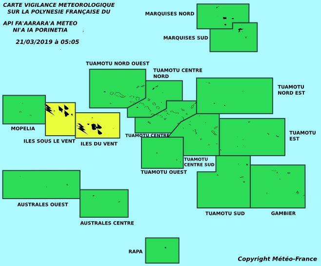 PAPEETE, le 21 mars 2019 - Les services de Météo France ont placé cet archipel en vigilance jaune, ce jeudi matin. Une amélioration est attendue demain en cours de journée.