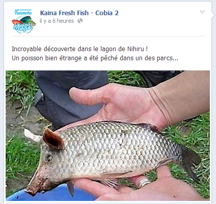 L'entreprise Kaina Fresh Fish, qui vend à Tahiti des poissons frais des Tuamotu, a de son côté partagé sur sa page Facebook la photo d'un étrange spécimen de poisson trouvé dans le lagon de Nihiru :