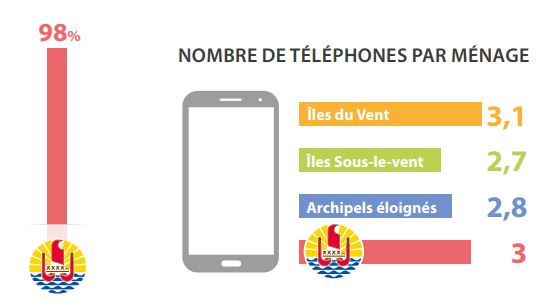 98% des ménages polynésiens sont désormais équipés d'au moins un téléphone portable. En moyenne, ils en possèdent même trois par foyer. Les archipels ont d'ailleurs totalement rattrapé leur retard sur Tahiti et Moorea dans ce domaine. En Polynésie, 63% des téléphones sont des smartphones. L'usage chez les enfants reste limité, puisque 10% des moins de 11 ans seulement ont un mobile. Par contre les jeunes adolescents sont 56% à être équipés, un taux qui monte à 83% chez les plus de 15 ans.