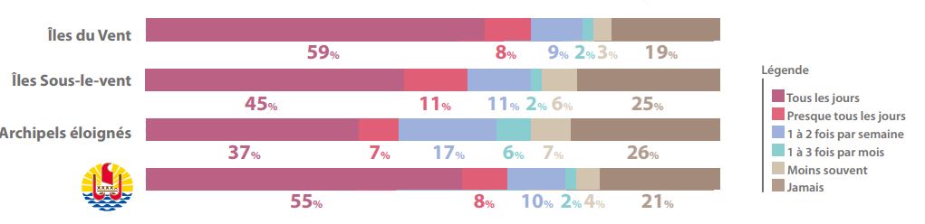 55% des Polynésiens se connectent tous les jours au Web, et même les archipels sont très connectés. Notre appareil préféré pour surfer est désormais le smartphone (nous sommes 58% à nous y connecter tous les jours). Les services web préférés des Polynésiens sont les réseaux sociaux (avec une forte hausse d'Instagram, qui reste malgré tout loin derrière Facebook), les emails, le chat et les vidéos en streaming. Les services les moins appréciés : la presse payante (98% des internautes du fenua n'ont jamais consulté un article payant) et la musique/vidéo payante légale (87% n'ont jamais acheté ce genre de produits numériques).