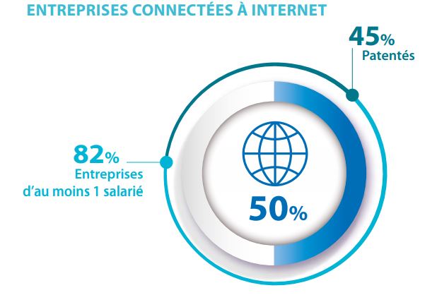 Parmi les entreprises ayant au moins un salarié, 82% ont une connexion à internet. Deux fois plus que chez les patentés. Les entreprises connectées sont 90% à avoir de l'ADSL, et seulement 1% à avoir de la fibre (enquête réalisée en juillet 2017). Mais 25% des entreprises déjà connectées envisagent de passer à la fibre (15% des patentés).