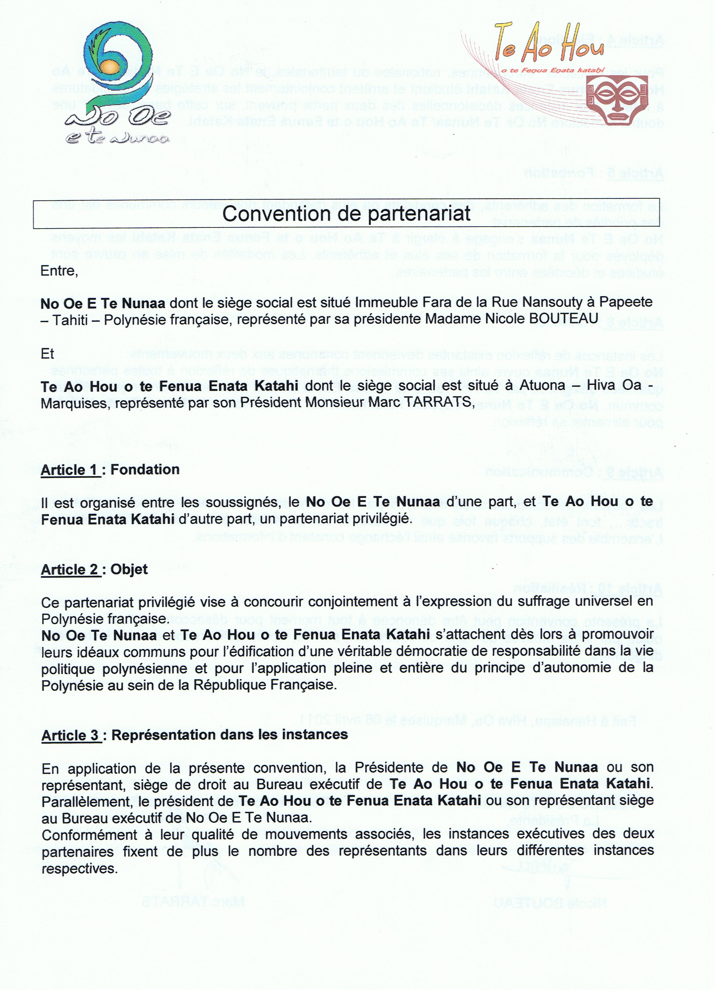 Sur le plan du partenariat avec la formation locale Te Ao Hou o te Fenua Enata Katahi, ce déplacement a vu la concrétisation du lien qui unit nos deux formations politiques par la signature d'une Convention de partenariat. Ce déplacement a confirmé l'adhésion des deux formations politiques aux mêmes valeurs morales et politiques qui animent leur engagement et leurs actions politiques respectives.