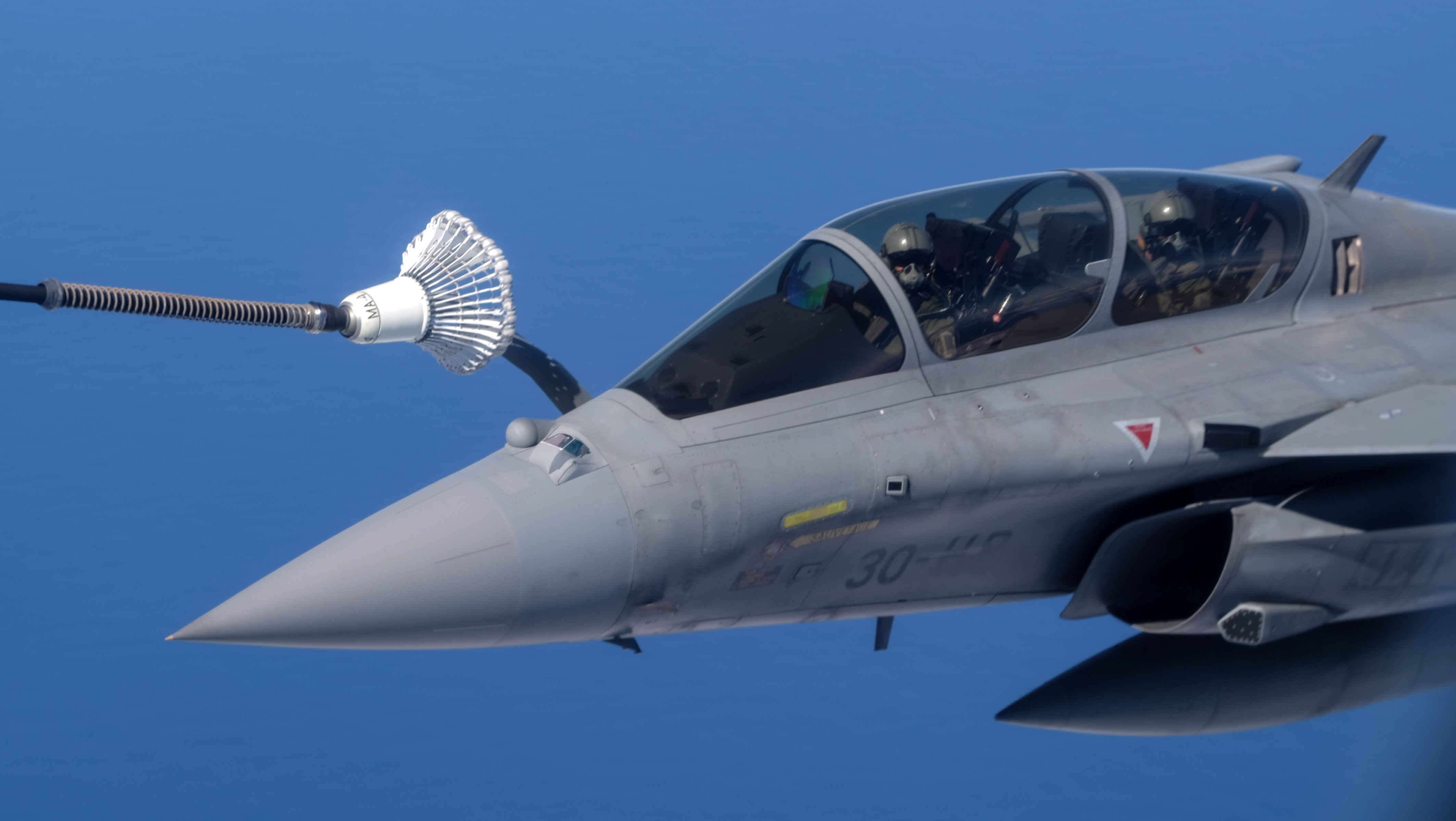 Les Rafale ont été ravitaillés deux fois. Une manœuvre très technique. « La chance du Phénix, c’est que c’est un avion très stable, avec des automatismes qui nous permettent de voler de manière optimale pour faciliter les chasseurs lors de la phase de ravitaillement en vol », nous détaille le pilote du ravitailleur. En tant que commandant de vol, c’est lui qui va surveiller la trajectoire, la vitesse de l’avion, et donner des consignes à l’opérateur de ravitaillement et aux pilotes de chasse.