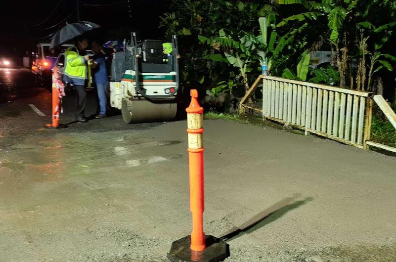 Tahiti, le 16 janvier 2022 - La circulation a été rétablie samedi soir sur le pont de la rivière Teruvea à Pueu, qui s'était affaissé à la suite des fortes intempéries dans la nuit de vendredi à samedi. Mais la circulation reste interdite aux engins de plus de 3,5 tonnes.