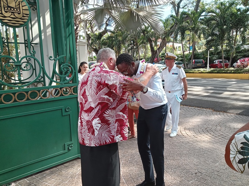 Après avoir rencontré les jeunes du RSMA, Hervé Berville a été accueilli, à la présidence, par le président du Pays Moetai Brotherson ainsi que du ministre en charge du secteur primaire, Taivini Teai. Crédit photo SD