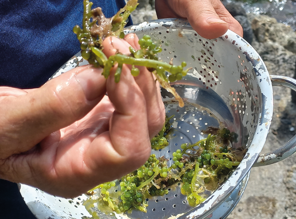 Le remu vine, ou Caulerpa racemosa, est une algue verte appréciée en Polynésie agrémentée de lait de coco et de citron. Elle croque sous les dents. “Gustativement parlant, elle est excellente. Elle a le goût de la mer. Elle est légèrement épicée. Je dirais un peu poivrée.” En fermant les yeux, “on peut facilement imaginer que ce sont des œufs de poisson”. Ailleurs, elle a été baptisée le “caviar vert”. Elle peut se savourer seule tout juste sortie de l’eau et rincée à l’eau claire, ou bien encore avec du riz, mélangée avec de la tomate, de l’ail, du gingembre et de l’ail hachés. Au Japon, sur l’île de Okinawa, elle entre dans la composition de sushis, de glaces… Elle agrémente des salades. Sa couleur vive – qui varie selon la maturité – lui vaut aussi d’être appréciée à l’étape du dressage d’assiette.