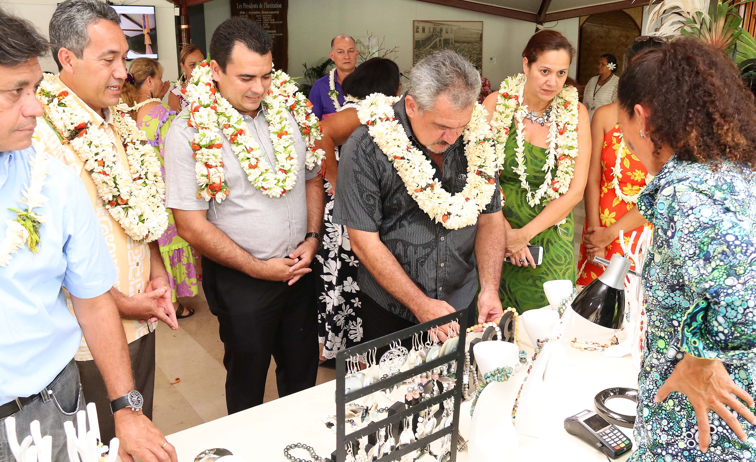 PAPEETE, le 9 février 2017. Le ministre de la Culture et de l’artisanat, Heremoana Maamaatuaiahutapu, a officiellement ouvert le 16e salon de la « Bijouterie d’art polynésien », jeudi matin, dans le hall de l’Assemblée de la Polynésie française, een présence notamment du vice- président, Teva Rohfritsch, de la ministre de l’Education, Nicole Sanquer-Fareata, et de la présidente de l’association Bijouterie d’art polynésien, Fauura Bouteau.