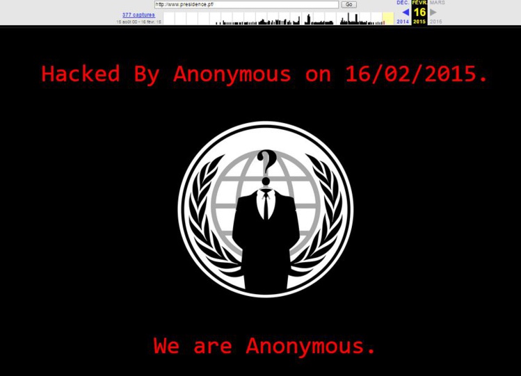 PAPEETE, le 17 février 2015 - Hier lundi 16 février, le site de la présidence de la Polynésie française, www.presidence.pf, a été piraté par le collectif de hackers anonymes Anonymous, pour la deuxième fois affirment les pirates. Nous n'avons pas entendu parlé du premier piratage.