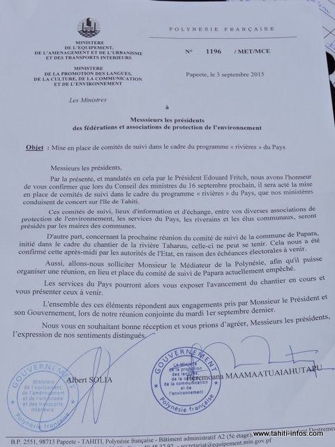 Le syndicat déplore également les entêtes qui sont stipulés dans les courriers du gouvernement : "Sur le soi-disant protocole qu'on attendait, on reçoit un courrier avec l'entête de la FAPE, dont le président est Winiki Sage. La FAPE, c'est la Fédération des Associations de Protection de l'Environnement. No Te Aru Tai Mareva ne représente pas seulement des associations de protection de l'environnement, il représente aussi les propriétaires fonciers de la Polynésie Française. Le statut a été transmis au Président et au haut-commissaire. Nous sommes officiels, la FAPE ne représente que deux personnes. Il ne négocie et ne parle qu'avec la FAPE. Tous les courriers que je reçois c'est toujours avec l'entête de la FAPE, je ne suis pas FAPE. On ne nous respecte pas."
