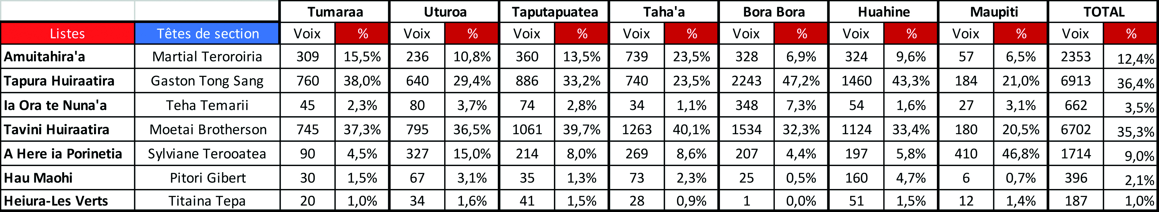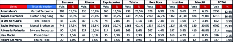 Dans le détail, le parti rouge te blanc se maintient à Bora Bora et Huahine, finit avec une courte avance à Tumaraa et Maupiti, et se trouve relégué à Uturoa, Taputapuātea et Taha’a.