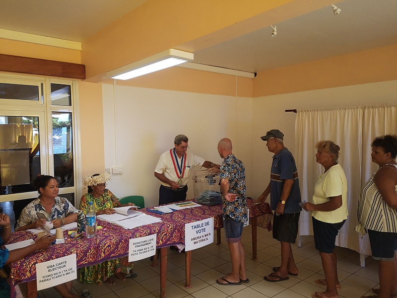 Bureau de vote de Taputapuatea à Raiatea. Le Tapura a devancé d'une courte tête le Tavini dans la section des îles Sous-le-Vent. Crédit photo : Vaitea.