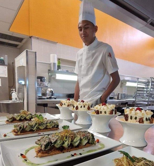 Détenteur de la médaille d’or régionale dans la catégorie “cuisine froide ”, Léon Tehaurai a su se dépasser pour atteindre la note de 16,8/20 lors de l’épreuve finale à Paris, à l’issue de laquelle il a décroché le titre tant convoité de Meilleur apprenti de France. Une réussite doublement méritée, puisque le jeune homme a dû s’adapter très rapidement à un nouvel environnement pour pouvoir se mesurer aux meilleurs candidats de l’Hexagone. “Il est le seul ultramarin à avoir été sélectionné”, précise Joël Paschal, professeur et entraîneur de Léon qui l’a accompagné et préparé depuis le début de son aventure culinaire. Une fierté supplémentaire pour ce jeune homme qui a su dignement représenter la Polynésie et la perle du Pacifique dans la capitale. Accueilli au lycée Belliard à Paris, Léon Tehaurai a dû mettre de coté fatigue et appréhension pour affronter les derniers entraînements et ajustements avant l’épreuve finale : la confection des plats imposés. Au menu : paupiettes de légumes, sauce verte au yaourt végétal et îles flottantes aux fruits.