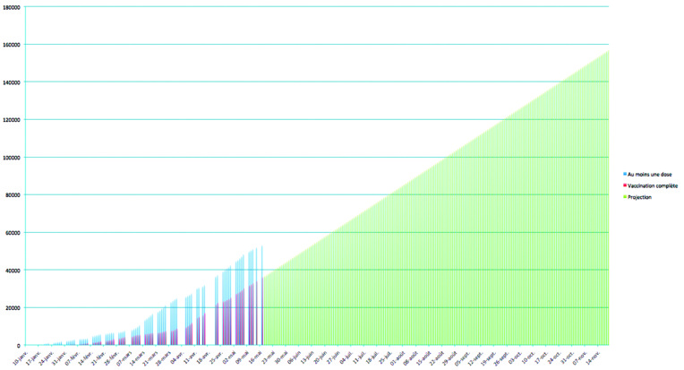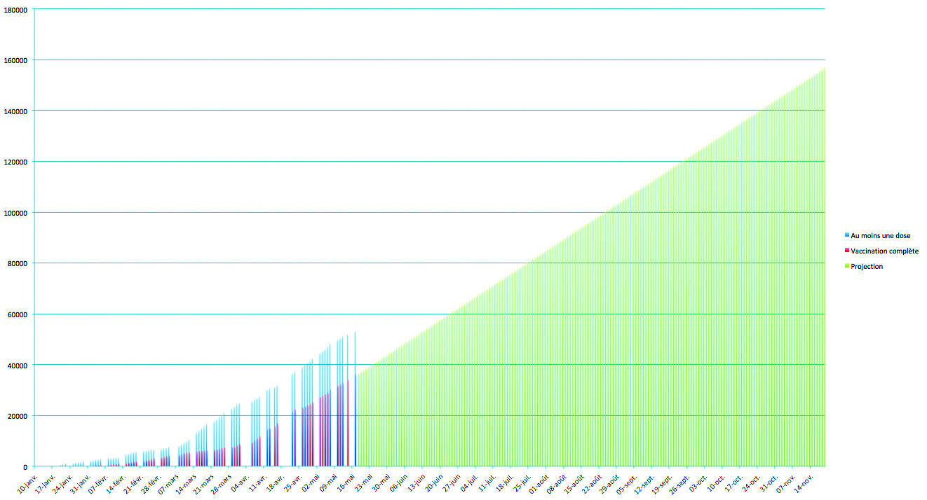 Pour se projeter dans les prochaines semaines –et surtout dans les prochains mois– sur cet objectif de 70% de vaccinés, on peut se baser sur le rythme récent de la vaccination. En effet la vaccination s'est accélérée depuis le début du mois de mars, suivie un mois plus tard –deuxième dose du vaccin Pfizer oblige– d'une accélération du nombre de “personnes complètement vaccinées”. En moyenne depuis début avril, on compte un rythme constant de près de 650 personnes supplémentaires entièrement vaccinées chaque jour. Une projection de ce rythme de croisière sur les prochaines semaines fait tomber les 70% de la population cible vaccinée au début du mois de novembre. Donc, dans un peu moins de six mois.