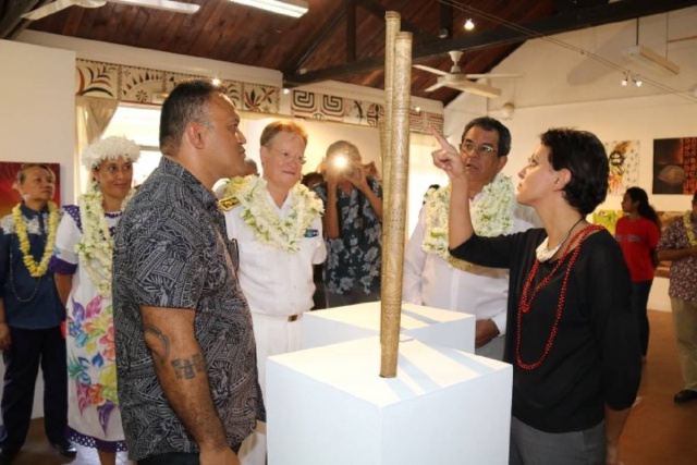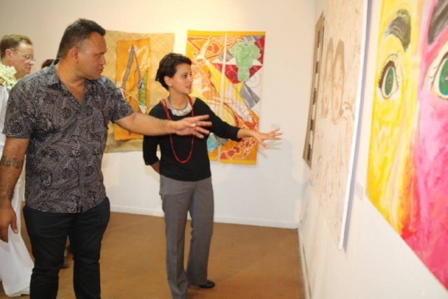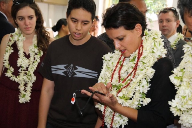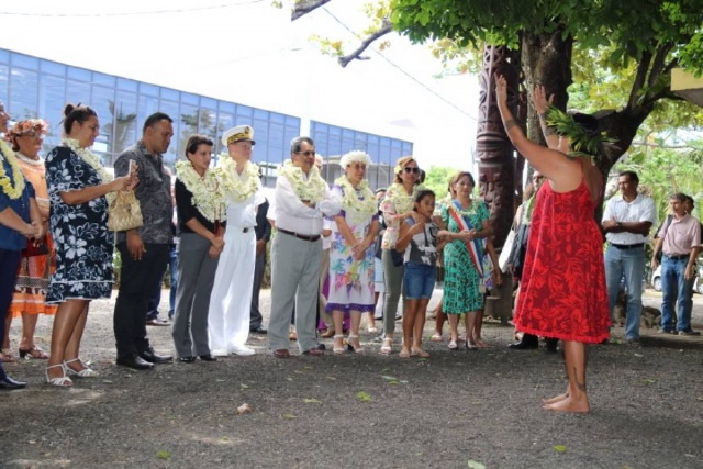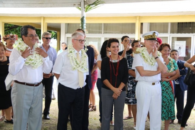 Najat Vallaud-Belkacem, ministre de l’Education nationale, a été accueillie par la ministre du Travail, de la représentante du maire de Papeete et son conseil municipal, du directeur du centre des métiers d’art et des étudiants de l’établissement.